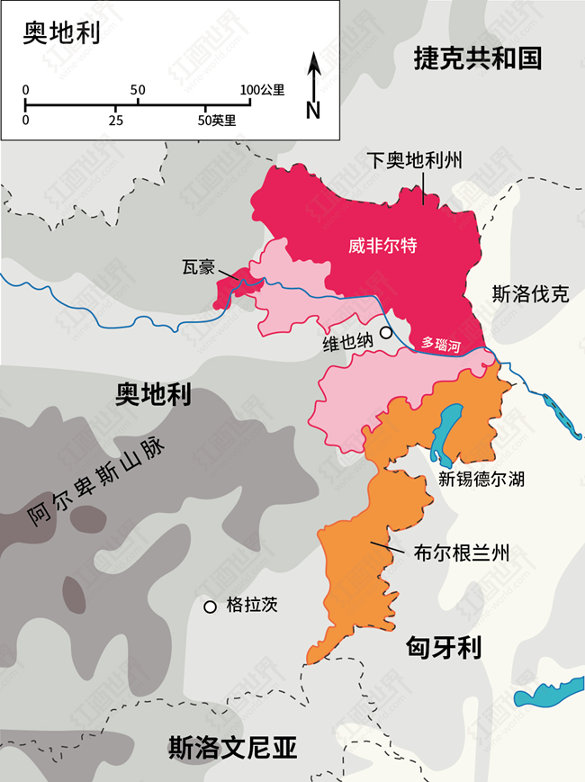 奧地利的葡萄酒產(chǎn)區(qū)與勃艮第處于同一緯度,但由于該國位于歐洲中部地區(qū),其氣候比勃艮第更具大陸性特征。北部產(chǎn)區(qū)會受到較冷的北風影響,而與匈牙利接壤的東部地區(qū)則享有較溫暖的東風。阿爾卑斯山覆蓋著奧地利的西部,因此葡萄種植區(qū)主要分布在該國的東部。這些葡萄種植區(qū)以涼爽的大陸性氣候為主,冬季嚴寒多雪,夏季溫暖短暫,秋季陽光明媚,本土葡萄品種在這樣的氣候條件下能夠很好地生長。