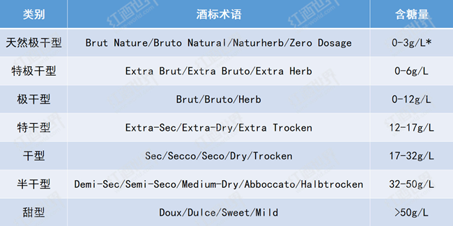 與靜止酒不同,起泡酒根據(jù)糖分含量對葡萄酒的劃分更為細(xì)致,含糖量由低到高可分為天然極干型、特極干型、極干型、特干型、干型、半干型和甜型七個類型。在使用傳統(tǒng)法(Traditional Method)、轉(zhuǎn)移法(Transfer Method)或罐中發(fā)酵法(Tank Method)釀造起泡酒時,酒液在最終封瓶或裝瓶前,都會使用由酒液和糖組成的調(diào)味液(Liqueur d'Expedition)進(jìn)行補液,調(diào)味液中的糖分含量便決定了最終成酒的含糖量,而天然極干型起泡酒在補液時不允許添加糖分,因此最終成酒糖分含量僅在0-3g/L之間。阿斯蒂起泡酒的糖分含量則由酒精發(fā)酵終止時酒中的殘?zhí)橇繘Q定。