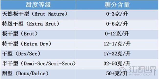 以上的分類方法主要適用于靜止葡萄酒,而起泡酒則根據糖分含量有單獨的分類方式: