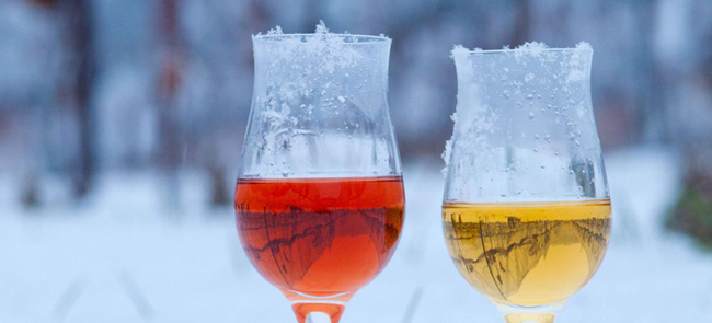 風干葡萄將“濃縮就是精華”奉為真理,冰葡萄則用冰霜鎖住精華。在寒冷地區,種植者們會將葡萄留于枝頭,成串結冰,直至嚴冬在夜間進行采收。冰葡萄硬度大,壓榨時需要施加較大壓力,榨出來的葡萄原汁僅有正常收獲葡萄的五分之一,卻濃縮了很高的糖分、酸度和風味物質。最終的成酒沒有風干葡萄酒那樣不加掩飾的奔放香氣與厚重酒體,而是以清潤甜美的風格自成一派。
