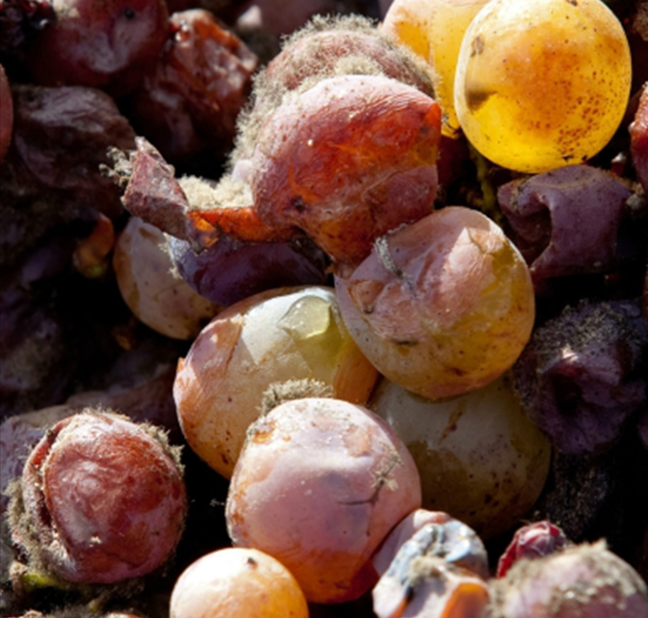 如圖所示,貴腐葡萄身形干癟,表皮還伴有細細的菌絲,若對該類葡萄沒有了解,定會認為這是發了霉的爛葡萄,但到了葡萄農這兒,它就是彌足珍貴的釀酒原料。要成為貴腐葡萄,被灰葡萄孢菌(Botrytis Cinerea)侵染是第一步,但灰葡萄孢菌“亦正亦邪”,在適當條件下,它可以轉化為有益的貴腐菌(Noble Rot),反之則有可能化身為誘導果實腐爛變質的灰腐菌(Grey Rot)。因此,健康果實感染灰葡萄孢菌的“造化”就全憑清晨是否潮濕多霧、午后是否晴朗干燥來決定了。成功被貴腐菌侵染的葡萄表皮穿孔、水分蒸發,糖分、酸度以及風味物質高度濃縮,與風干葡萄有著異曲同工之妙,卻比風干葡萄產量更低、更加難能可貴。