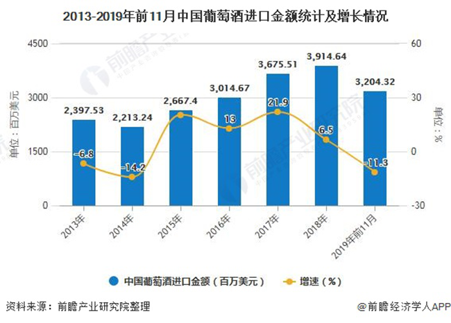 據(jù)中國海關總署數(shù)據(jù)顯示,2019年11月中國葡萄酒進口量為53218千升,同比下降-4.7%。累計方面,2019年1-11月中國葡萄酒進口量達到599355千升,同比下降10.6%。