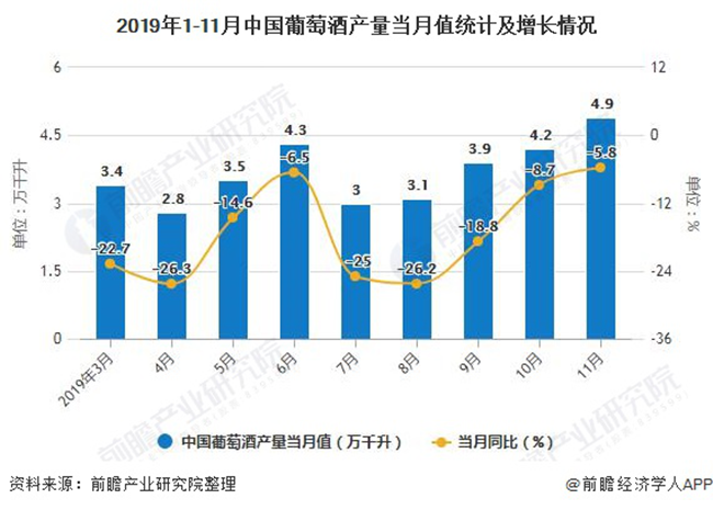 根據(jù)國家統(tǒng)計局數(shù)據(jù)顯示,2018年全年中國葡萄酒產(chǎn)量達到了62.9萬千升,累計下降7.4%。截止至2019年11月中國葡萄酒產(chǎn)量為4.9萬千升,同比下降5.8%。累計方面,2019年1-11月中國葡萄酒產(chǎn)量達到37.2萬千升,累計下降12.1%。
