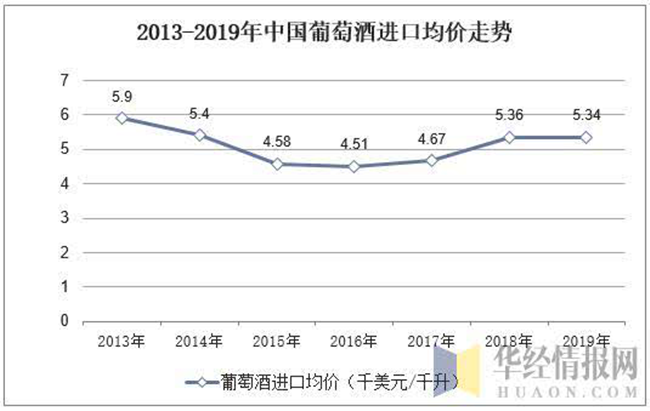 從進(jìn)口均價(jià)來看,近年來我國(guó)葡萄酒進(jìn)口均價(jià)基本維持在5千美元/千升,2015年葡萄酒進(jìn)口均價(jià)下降至5千美元/千升以下,2016年以后葡萄酒進(jìn)口價(jià)格又逐漸開始回升,據(jù)海關(guān)統(tǒng)計(jì)數(shù)據(jù)顯示,2019年國(guó)內(nèi)葡萄酒進(jìn)口均價(jià)為5.34千美元/千升,與2018年基本持平。
