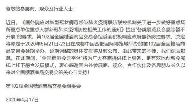 關(guān)于第102屆全國糖酒商品交易會(huì)延期舉辦的通知