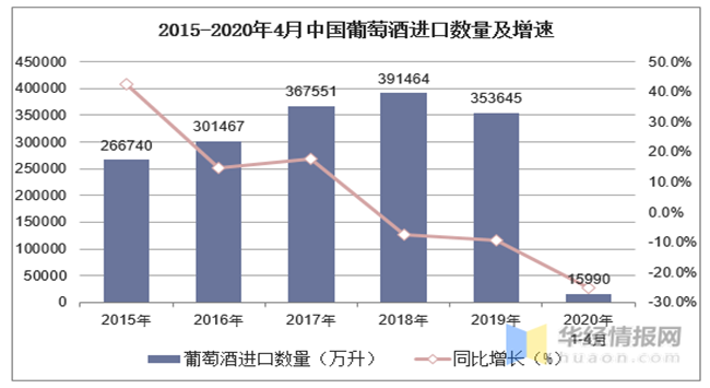 2015-2020年4月中國葡萄酒進(jìn)口數(shù)量及增速
