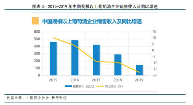 2019年,全國規(guī)模以上葡萄酒企業(yè)數量155家,銷售收入145.09億元,同比減少17.51%;實現利潤總額10.58億元,同比降低16.74%。2020年第一季度,銷售收入18.95億元,下降44.02%;利潤0.01億元,下降99.24%。全國葡萄酒行業(yè)規(guī)模以上企業(yè)經濟效益在2019年本就低迷的情況下,受新冠肺炎疫情影響,在2020年第一季度顯得更加慘淡。