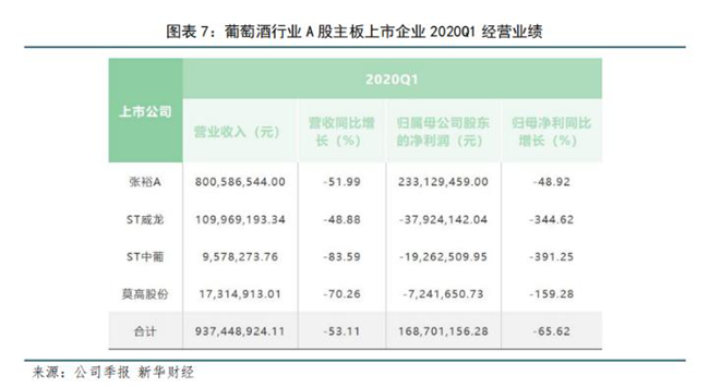 新冠肺炎疫情對于本就脆弱的葡萄酒行業(yè)來講,無疑是一記重錘。2020年第一季度,四家葡萄酒企業(yè)總營收9.37億元,同比降低53.11%;實現歸母凈利1.69億元,同比降低65.62%。只有張裕一家歸母凈利維持正值,其余皆為虧損。業(yè)內人士曾表示“葡萄酒行業(yè)'短期不樂觀',2020年將是國內葡萄酒市場近十年來最艱難的一年。”