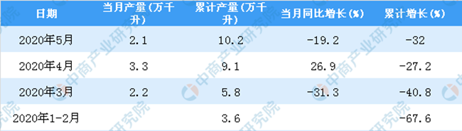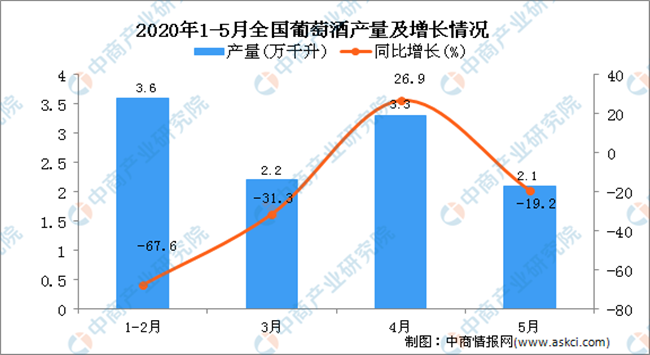 據(jù)中商產(chǎn)業(yè)研究院數(shù)據(jù)庫(kù)顯示,2020年5月全國(guó)葡萄酒產(chǎn)量下降,2020年5月全國(guó)葡萄酒產(chǎn)量為2.1萬(wàn)千升,同比下降19.2%。2020年1-5月全國(guó)葡萄酒產(chǎn)量為10.2萬(wàn)千升,同比下降32%。