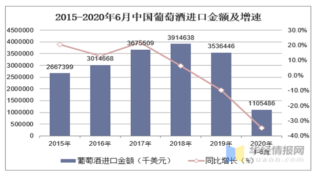 2015-2020年6月中國葡萄酒進口金額及增速