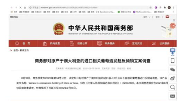 首先是中國對(duì)澳大利亞葡萄酒展開為期幾個(gè)月的反傾銷調(diào)查,一旦傾銷被認(rèn)證,中國可能對(duì)澳大利亞葡萄酒加征懲罰性關(guān)稅,關(guān)稅可能為商品價(jià)格的202.7%。