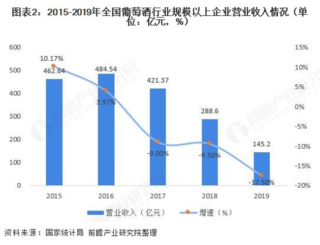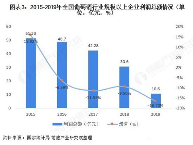 在營(yíng)業(yè)收入與利潤(rùn)總額方面,全國(guó)葡萄酒行業(yè)規(guī)模以上企業(yè)已經(jīng)連續(xù)三年“雙降”。2019年全國(guó)葡萄酒行業(yè)規(guī)模以上企業(yè)實(shí)現(xiàn)營(yíng)業(yè)收入145.2億元,同比下滑17.5%;實(shí)現(xiàn)利潤(rùn)總額10.6億元,同比下滑16.7%。