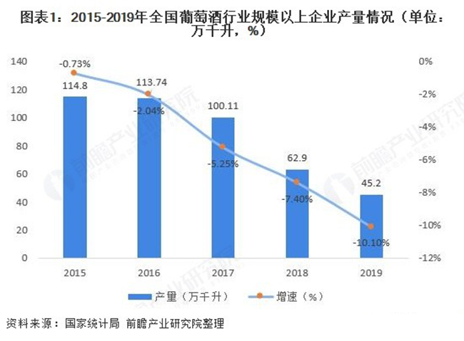 我國(guó)葡萄酒在經(jīng)歷了高速發(fā)展后自2013年進(jìn)入結(jié)構(gòu)性調(diào)整期,近年來(lái)行業(yè)產(chǎn)量、營(yíng)業(yè)收入和利潤(rùn)總額均呈現(xiàn)不同程度的下滑。在產(chǎn)量方面,為尋求供需平衡,行業(yè)持續(xù)降產(chǎn),2019年全國(guó)葡萄酒行業(yè)規(guī)模以上企業(yè)實(shí)現(xiàn)葡萄酒產(chǎn)量45.2萬(wàn)千升,同比下滑10.1%。