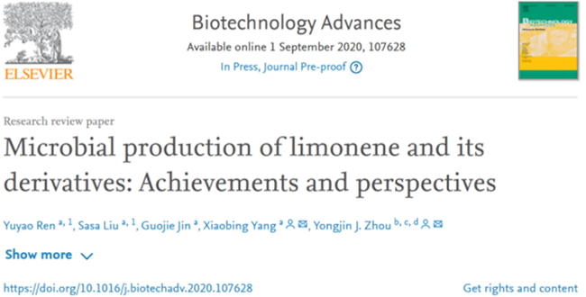 近日,葡萄酒學(xué)院楊曉兵副教授團(tuán)隊在著名生物技術(shù)學(xué)術(shù)期刊《Biotechnology Advances》(IF=10.744)發(fā)表了題為 “Microbial production of limonene and its derivatives: Achievements and perspectives” 的綜述文章,系統(tǒng)總結(jié)了近年來利用代謝工程和合成生物學(xué)策略合成檸檬烯及其衍生物研究進(jìn)展。西北農(nóng)林科技大學(xué)為第一署名單位,中科院大連化學(xué)物理研究所為合作單位;16級本科生任毓瑤和18級博士研究生劉灑灑為共同第一作者,我校楊曉兵副教授與大連化物所周雍進(jìn)研究員為共同通訊作者,我校靳國杰副教授參與了該綜述的撰寫工作?!禕iotechnology Advances》是生物技術(shù)領(lǐng)域頂級國際期刊,在105種應(yīng)用微生物與生物技術(shù)相關(guān)的雜志中排名第3,該雜志全年收錄文章在100篇左右,2019年H指數(shù)161。