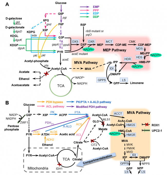 楊曉兵副教授團(tuán)隊長期致力于利用代謝工程和合成生物學(xué)策略構(gòu)建高價值化合物細(xì)胞工廠的研究工作。目前,已利用代謝工程策略成功改造圓紅冬孢酵母(Rhodosporidium toruloides)構(gòu)建了檸檬烯等單帖化合物、羥基化脂肪酸、氨基酸衍生物的細(xì)胞工廠,其中檸檬烯微生物合成相關(guān)研究工作獲得陜西省面上基金(2020JM177)、學(xué)??蒲袉踊?、國家級科創(chuàng)等支持,指導(dǎo)2016本科生任毓瑤畢業(yè)論文獲得校級畢業(yè)論文。該綜述介紹了微生物合成檸檬烯及其衍生物面臨的機(jī)遇與挑戰(zhàn),詳細(xì)闡述了異戊二烯途徑多樣性、代謝路徑關(guān)鍵酶的發(fā)掘與表征、宿主細(xì)胞代謝路徑的理性調(diào)控、輔因子平衡、檸檬烯及其衍生物生物毒性的解除及提升宿主微生物魯棒性的策略等內(nèi)容。本綜述詳盡討論了大腸桿菌、釀酒酵母、藍(lán)細(xì)菌和產(chǎn)油酵母等生產(chǎn)平臺菌株的優(yōu)勢與不足,為系統(tǒng)地理性改造微生物代謝網(wǎng)絡(luò)構(gòu)建單帖細(xì)胞工廠提供了科學(xué)參考。