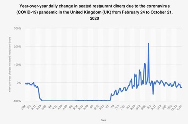雖然8月期間英國(guó)政府推出“半價(jià)用餐“政策來(lái)拉動(dòng)消費(fèi),但好景不長(zhǎng),第二波疫情再一次使酒吧和餐廳行業(yè)陷入危機(jī)。