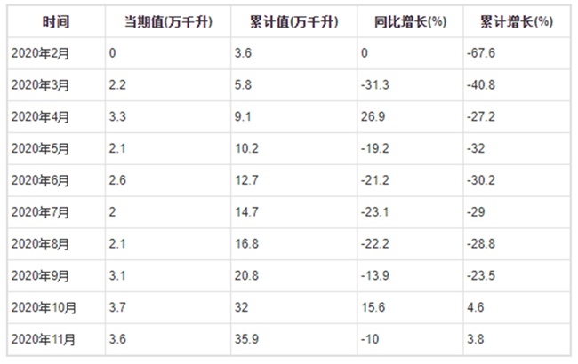 2020年1-11月全國葡萄酒產(chǎn)量分月數(shù)據(jù)