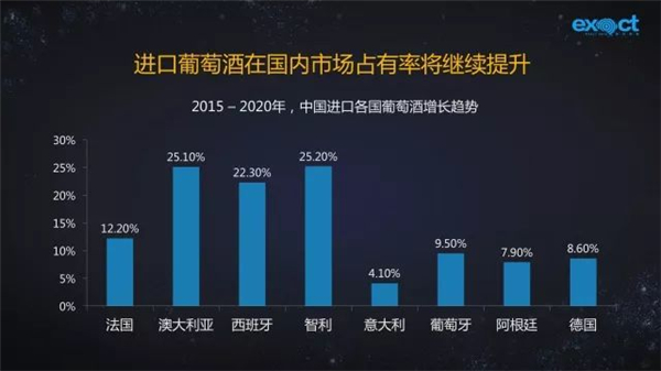 據統計數據顯示,2017年,中國消費的葡萄酒中約1/3來自于進口,進口總量為7.5億升,同比增長16.9%。其中七成多為瓶裝葡萄酒。從進口來源國來看,中國進口葡萄酒主要來自于法國、澳大利亞、智利、西班牙。