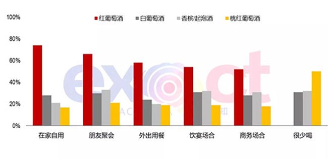 消費(fèi)者不同場(chǎng)合飲用各類(lèi)葡萄酒占比(2017)