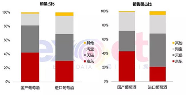 從平臺(tái)分布來(lái)看,無(wú)論國(guó)產(chǎn)還是進(jìn)口葡萄酒均在天貓、京東、淘寶銷(xiāo)售情況最佳,銷(xiāo)售占比超過(guò)90%。對(duì)比來(lái)看,國(guó)產(chǎn)葡萄酒在京東的銷(xiāo)售優(yōu)于其他平臺(tái),而進(jìn)口葡萄酒則以天貓為主要銷(xiāo)售陣地。