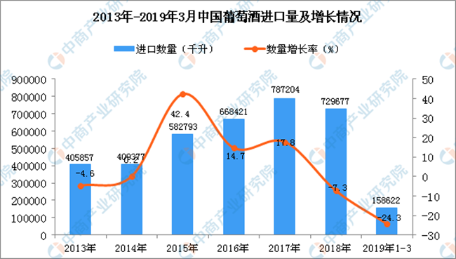 據(jù)中商產(chǎn)業(yè)研究院數(shù)據(jù)庫(kù)顯示,2013年-2017年中國(guó)葡萄酒進(jìn)口量增長(zhǎng),共增長(zhǎng)381347千升,增長(zhǎng)93.96%;2018年中國(guó)葡萄酒進(jìn)口量回落,2019年1-3月中國(guó)葡萄酒進(jìn)口量為158622千升,同比下降24.3%。