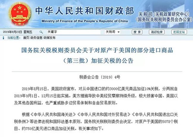 公告顯示:2019年8月15日,美國(guó)政府宣布,對(duì)從中國(guó)進(jìn)口的約3000億美元商品加征10%關(guān)稅,分兩批自2019年9月1日、12月15日起實(shí)施。美方措施導(dǎo)致中美經(jīng)貿(mào)摩擦持續(xù)升級(jí),極大損害中國(guó)、美國(guó)以及其他各國(guó)利益,也嚴(yán)重威脅多邊貿(mào)易體制和自由貿(mào)易原則。