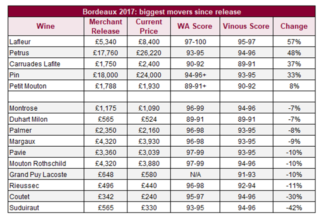 與2016年份一樣,拉弗爾Lafleur的表現(xiàn)最佳,目前價(jià)格比發(fā)布價(jià)漲了57%。一級(jí)酒莊的副牌葡萄酒也再次熱賣– 小拉菲Carruades Lafite漲價(jià)37%,而小木桐Petit Mouton則漲價(jià)8%。