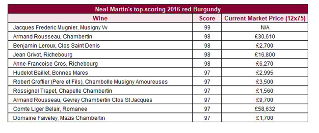 Martin總結(jié):“勃艮第的頂級(jí)與其它葡萄酒之間,它們的質(zhì)量差距遠(yuǎn)小于其市場價(jià)格差距”。 下表列出了最高得分的2016年份勃艮第葡萄酒及其目前市場價(jià)格。