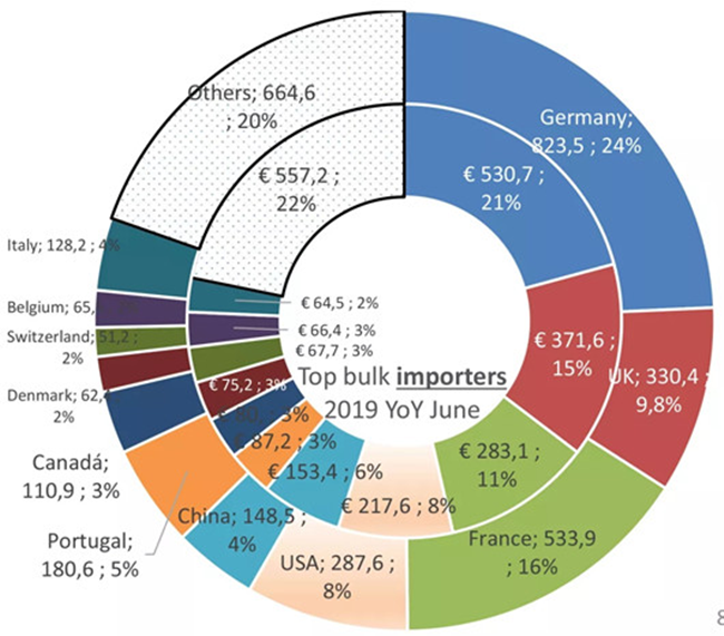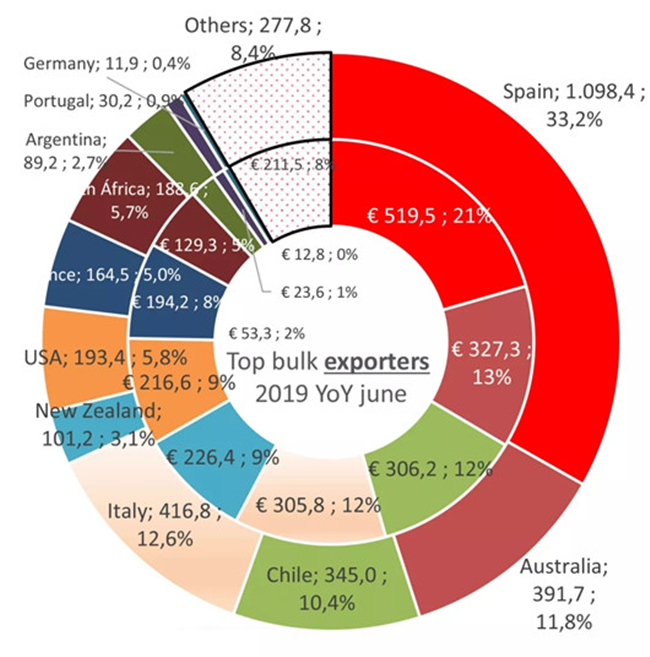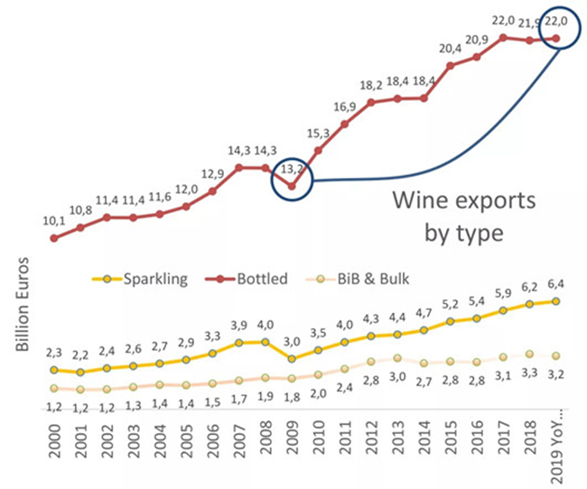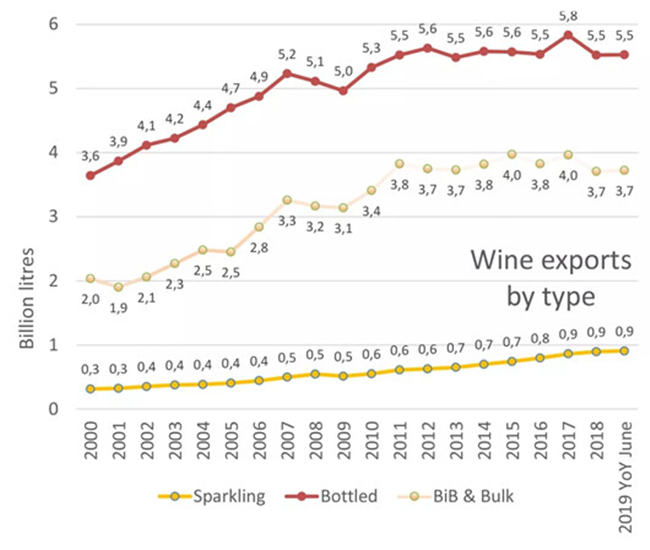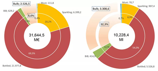 截止至2019年6月,散裝葡萄酒的出口價值為25億歐元,占所有葡萄酒出口總價值的8%。盒中袋裝葡萄酒(BIB)的出口價值占出口總價值的2%,起泡酒占出口總價值的20.2%,瓶裝酒占出口總價值的69.5%,葡萄汁占出口總價值的0.4%。