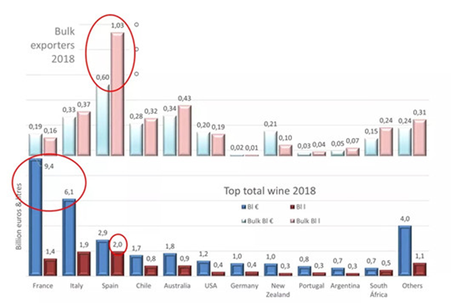 從散裝酒出口數量上來看,西班牙遙遙領先,達到了10.3億升,總價值為6億歐元。但是從葡萄酒總銷售額方面來看(不包括散裝酒),法國和意大利葡萄酒在出口價值方面遙遙領先,法國達到了94億歐元,意大利達到了61億歐元,而西班牙僅為20億歐元。