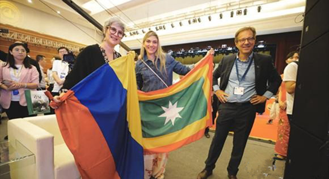 哥倫比亞SAS貿易觀光部副總經理瑪莎·佩雷斯·古緹雷斯女士代表巴蘭基亞從呂梁市委副書記、政府市長王立偉手中接過Spirits Selection大獎賽的酒杯,繼續傳遞這項國際級的酒類盛事。山西省政協副主席、呂梁市委書記李正印出席接旗儀式并代表2019年賽事主辦地講話。