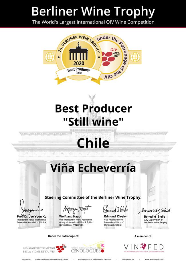 (2020柏林葡萄酒大獎賽-智利最佳生產商 榮譽證書)