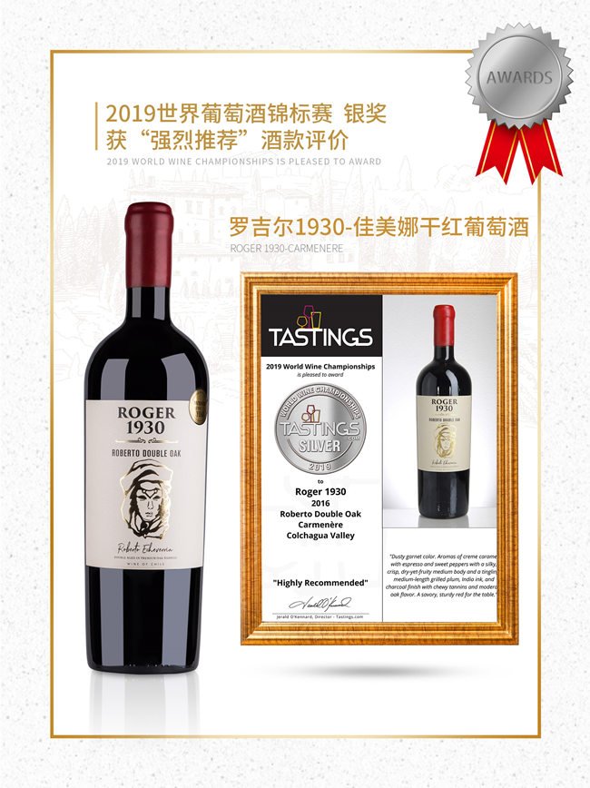羅吉爾1930-羅伯特紅葡萄酒呈深邃的寶石紅色;酒香非常柔和,伴有精致的黑加侖,黑李子的果香以及甘草、煙熏的香氣;口感優雅豐富,層次鮮明且多變,單寧強勁,令人十分愉悅。在榮獲2020柏林葡萄酒大獎賽金獎的榮譽之前,就已經獲得了2019世界葡萄酒錦標賽金獎的榮譽,以及“無與倫比”酒款評價!
